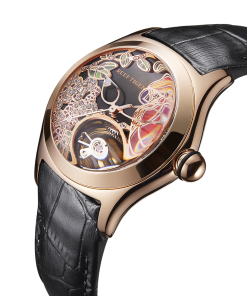 黑色表盤,帶鸚鵡圖案標(biāo)記。時(shí)、分、秒顯示。這款奢華腕表的表盤 12 點(diǎn)鐘位置印有品牌標(biāo)識(shí)。
