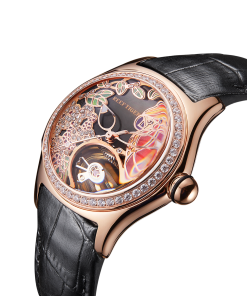 黑色表盤,帶鸚鵡圖案標記。時、分、秒顯示。這款奢華腕表的表盤 12 點鐘位置印有品牌標識。