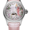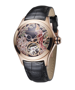 藍(lán)色表盤,帶鸚鵡圖案標(biāo)記。時(shí)、分、秒顯示。這款奢華腕表的表盤 12 點(diǎn)鐘位置印有品牌標(biāo)識。