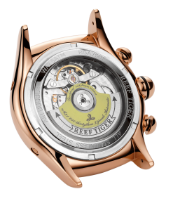 白色鏤空表盤,帶兩個(gè)子表盤。 12 點(diǎn)鐘位置有兩個(gè)年份和月份窗口。 6 點(diǎn)鐘位置設(shè)有陀飛輪顯示。