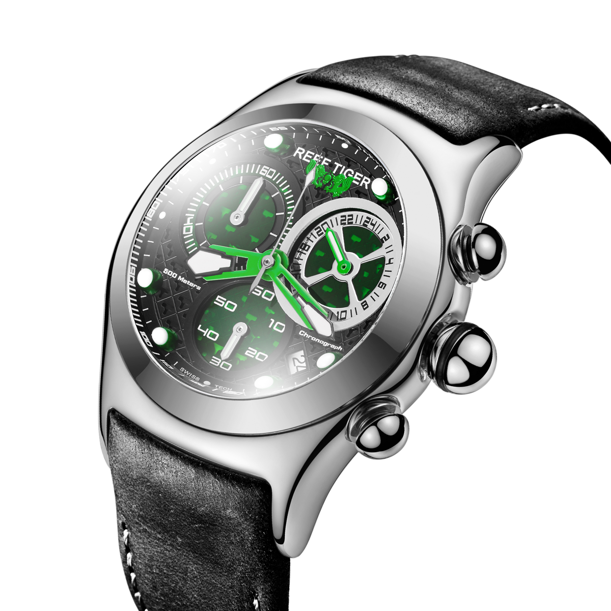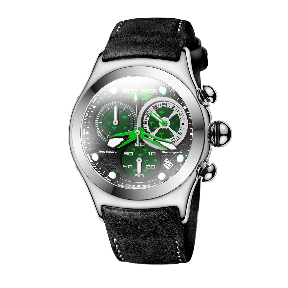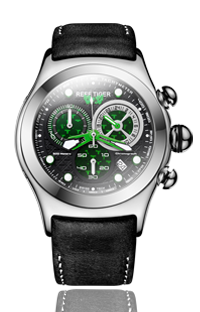 黑色表盤,三個小表盤。 日期位于 4 點(diǎn)鐘和 5 點(diǎn)鐘之間。