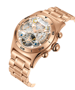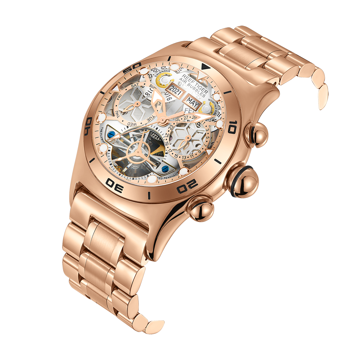 Aurora Big Bang 鏤空腕表。耐用的玫瑰金不銹鋼固定表圈還配有可打造專業(yè)外觀的提案和演示。耐用的聚酯前后蓋,協(xié)調(diào)一致。