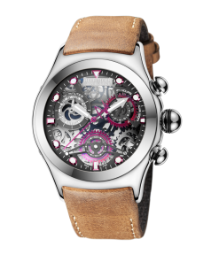 鏤空表盤配有三個子表盤。計時碼表、小時、分鐘、秒和日期顯示。這款時尚的男士手表在表盤 12 點鐘位置印有其標(biāo)志。