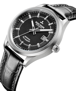 黑色表盤(pán),帶棒狀標(biāo)記。時(shí)、分、秒和日期顯示。這款豪華腕表的表盤(pán) 12 點(diǎn)鐘位置印有其標(biāo)志。