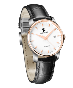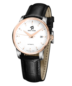 白色表盤。這款雙色手表采用經(jīng)典的圓形表殼,搭配黑色表盤(玫瑰金條形刻度)和日期功能,非常適合男士佩戴。