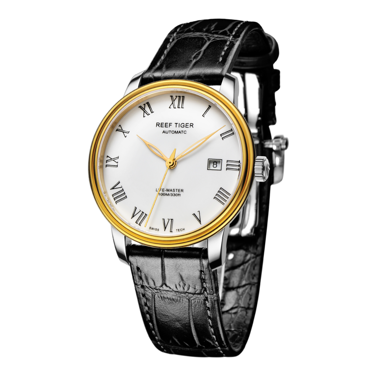 Reef Tiger 經(jīng)典 Life-Master 腕表。耐用的不銹鋼黃金表圈也適合打造專(zhuān)業(yè)的提案和演示。耐用的聚酯前后蓋與協(xié)調(diào)。