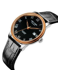 黑色表盤,帶羅馬刻度。時、分、秒和日期顯示。這款奢華腕表的表盤 3 點鐘位置印有其標(biāo)志。