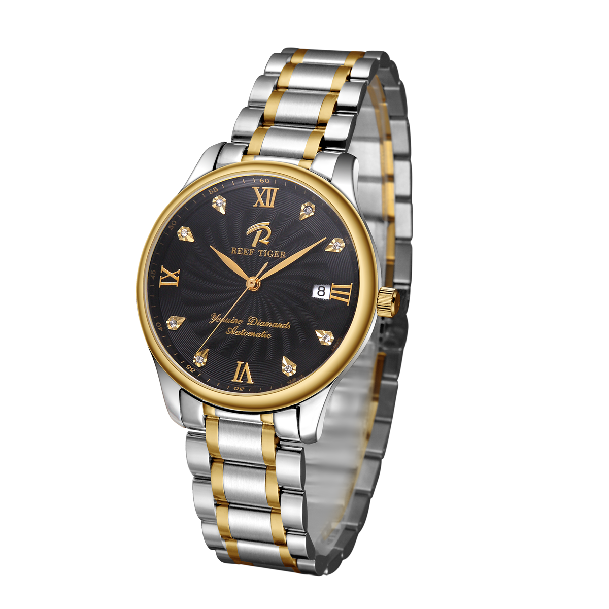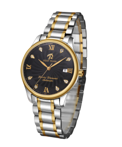 黑色風(fēng)車表盤。這款雙色手表采用經(jīng)典的圓形表殼,搭配黑色風(fēng)車表盤(鉆石刻度)和日期功能,非常適合男士佩戴。