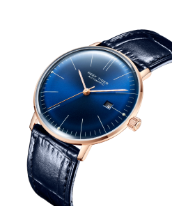 藍色表盤,帶棒狀標記。時、分、秒和日期顯示。這款奢華腕表的表盤 12 點鐘位置印有品牌標識。