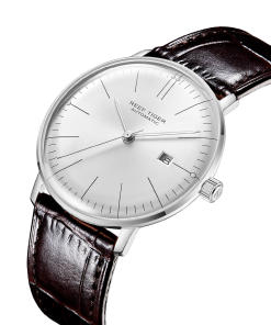 白色表盤,帶棒狀標(biāo)記。時、分、秒和日期顯示。這款奢華腕表的表盤 12 點鐘位置印有品牌標(biāo)識。