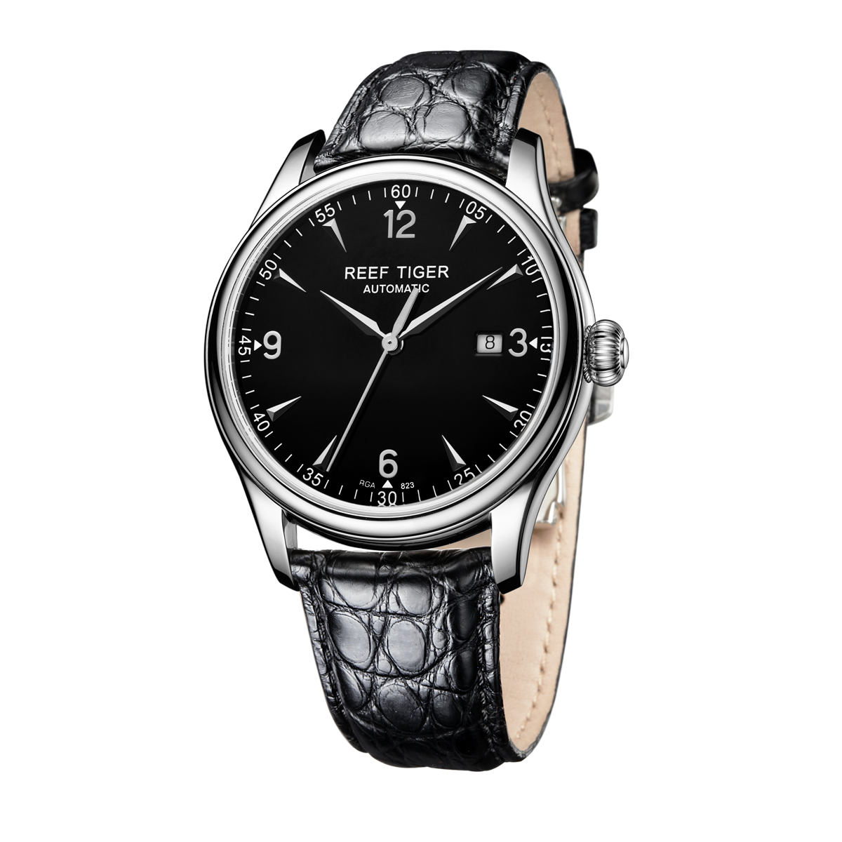 黑色表盤,帶銀色棒狀和羅馬數(shù)字標記。時、分、秒和日期顯示。