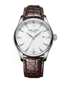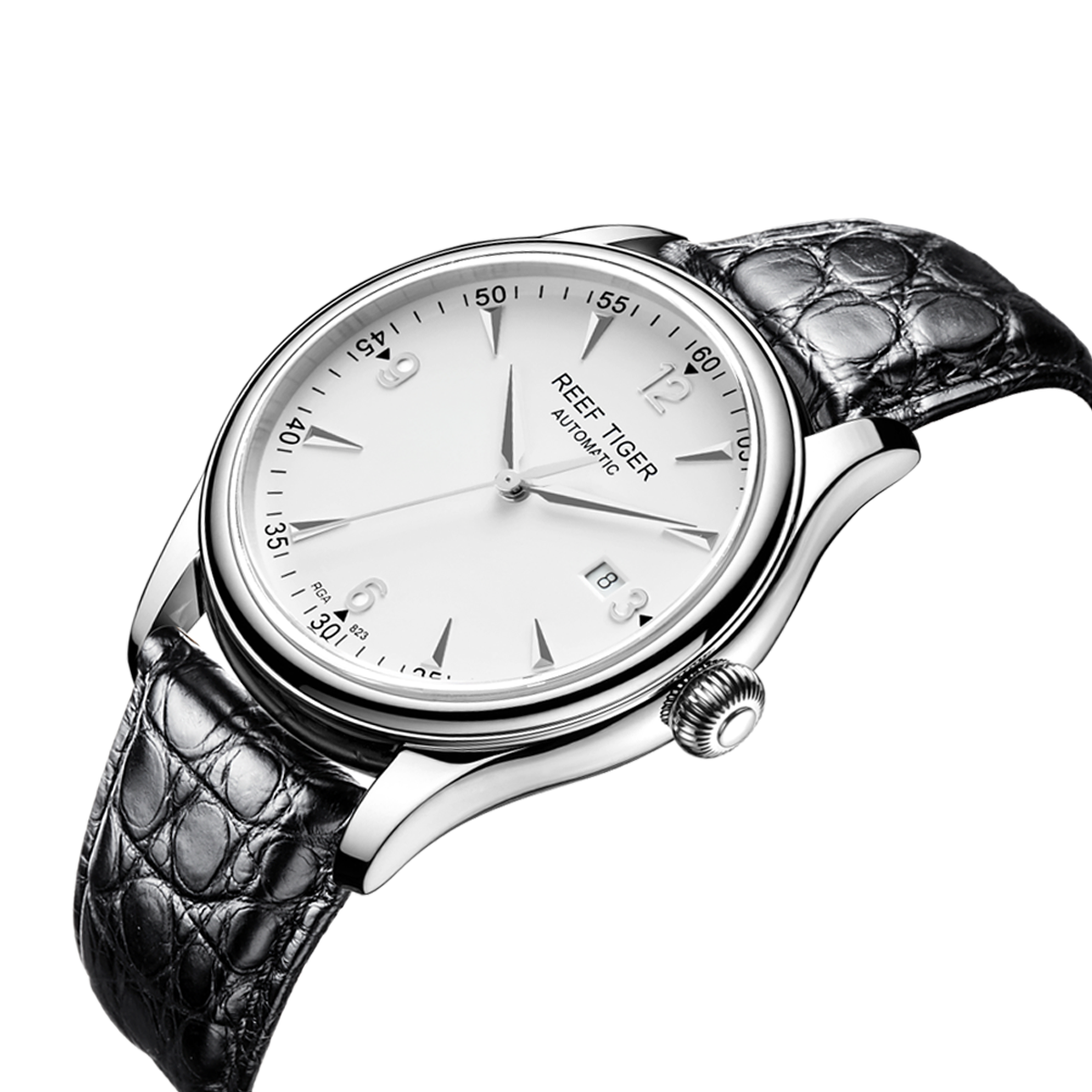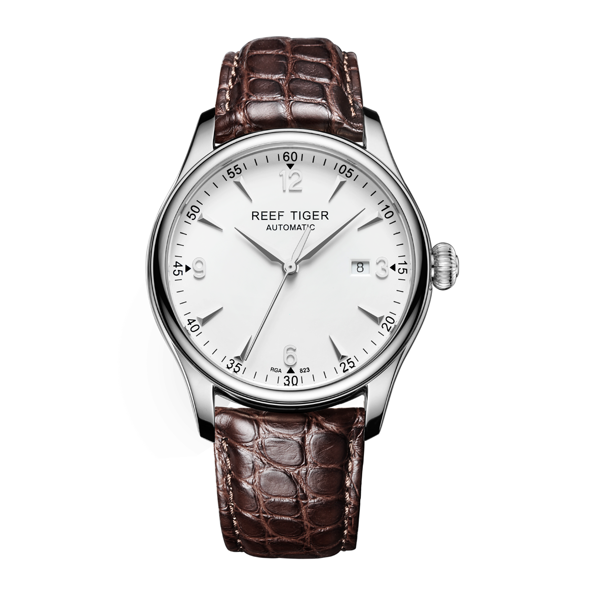 白色表盤,帶銀色棒狀和羅馬數(shù)字標(biāo)記。時、分、秒和日期顯示。