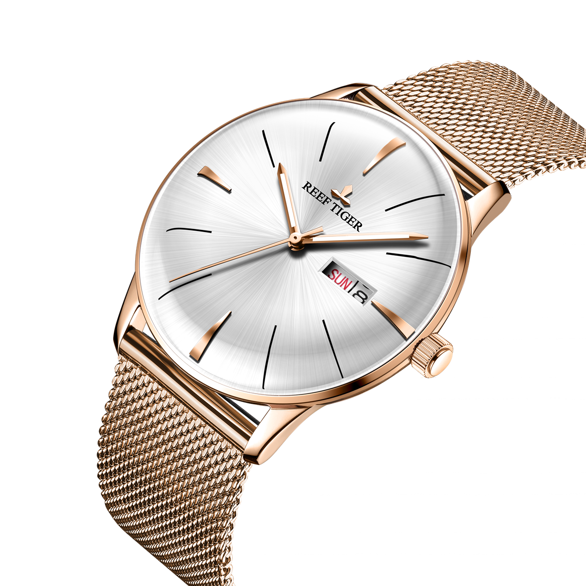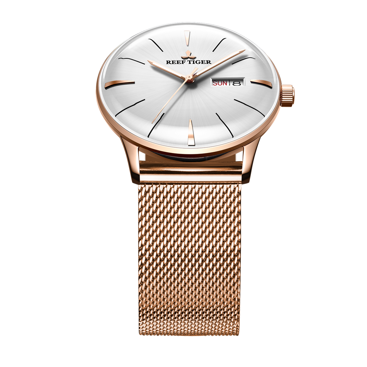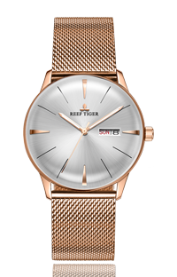 Reef Tiger 經(jīng)典 Heritor 腕表。耐用的不銹鋼玫瑰金表圈還配有可打造專業(yè)外觀的提案和演示。耐用的聚酯前后蓋與協(xié)調(diào)。