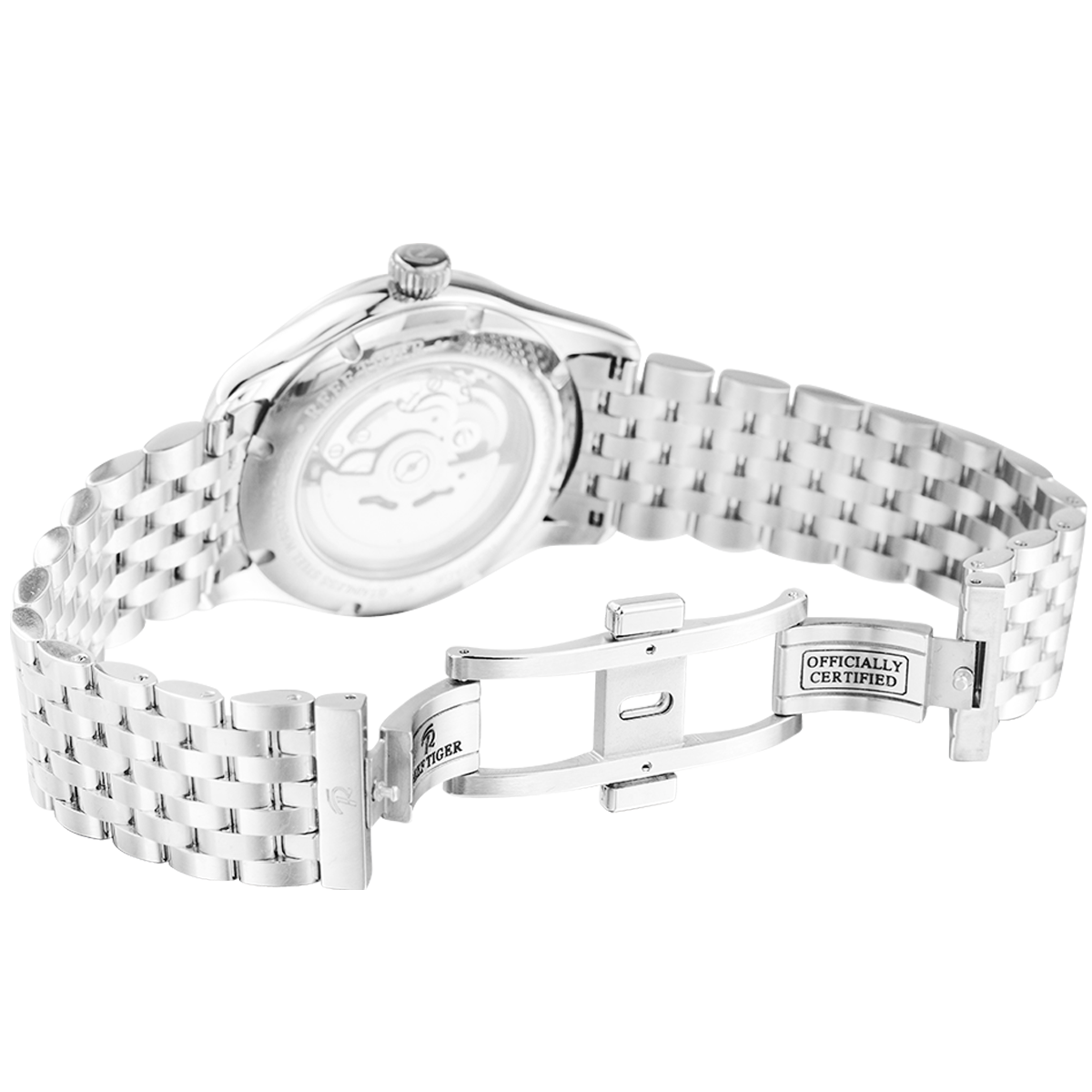 白色表盤,配銀色棒狀和羅馬數(shù)字標(biāo)記。小時(shí)、分鐘、秒和日期顯示。