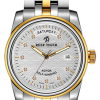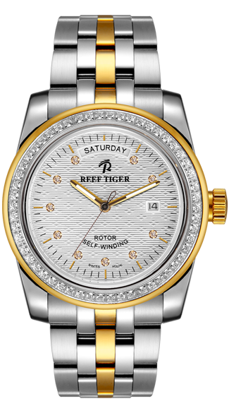 白色星形圖案表盤。這款雙色腕表采用經(jīng)典圓形表殼搭配白色表盤(十顆鉆石和十二個黃金棒狀時標(biāo)),日期和星期顯示分別位于 3:00 和 12:00 位置。