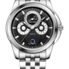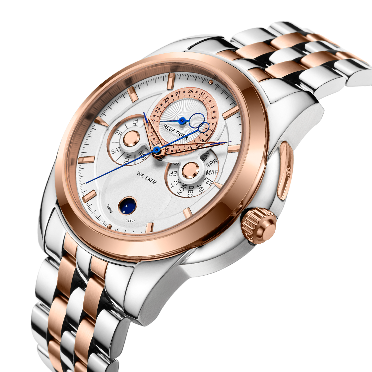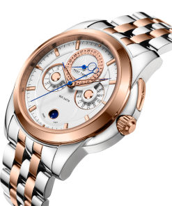 白色表盤(pán)搭配玫瑰金棒狀標(biāo)記。時(shí)、分、秒、日期、星期和月相顯示。這款奢華腕表的表盤(pán) 12 點(diǎn)鐘位置印有品牌標(biāo)識(shí)。