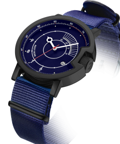 藍色表盤,帶阿拉伯數(shù)字標記。時、分、秒和日期顯示。這款奢華腕表的表盤 8 點鐘位置印有品牌標識。