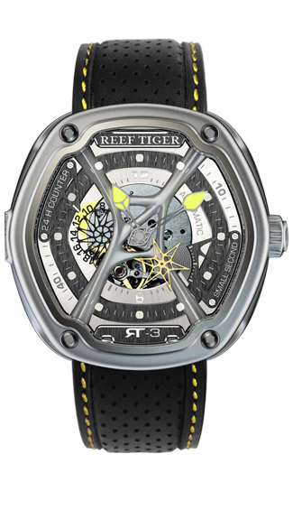 四層表盤,指針和時標(biāo)上涂有亮黃色夜光 Luminova,位于藍(lán)寶石玻璃下方,24 小時指示器上。時、分、小秒針和 24 小時指針顯示。這款豪華手表的表盤 12 點鐘位置印有其標(biāo)志。